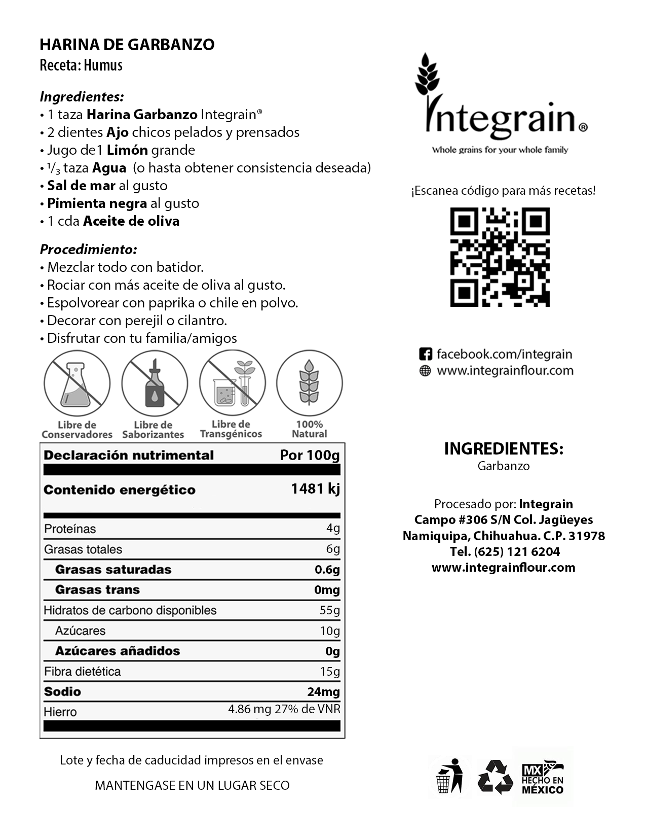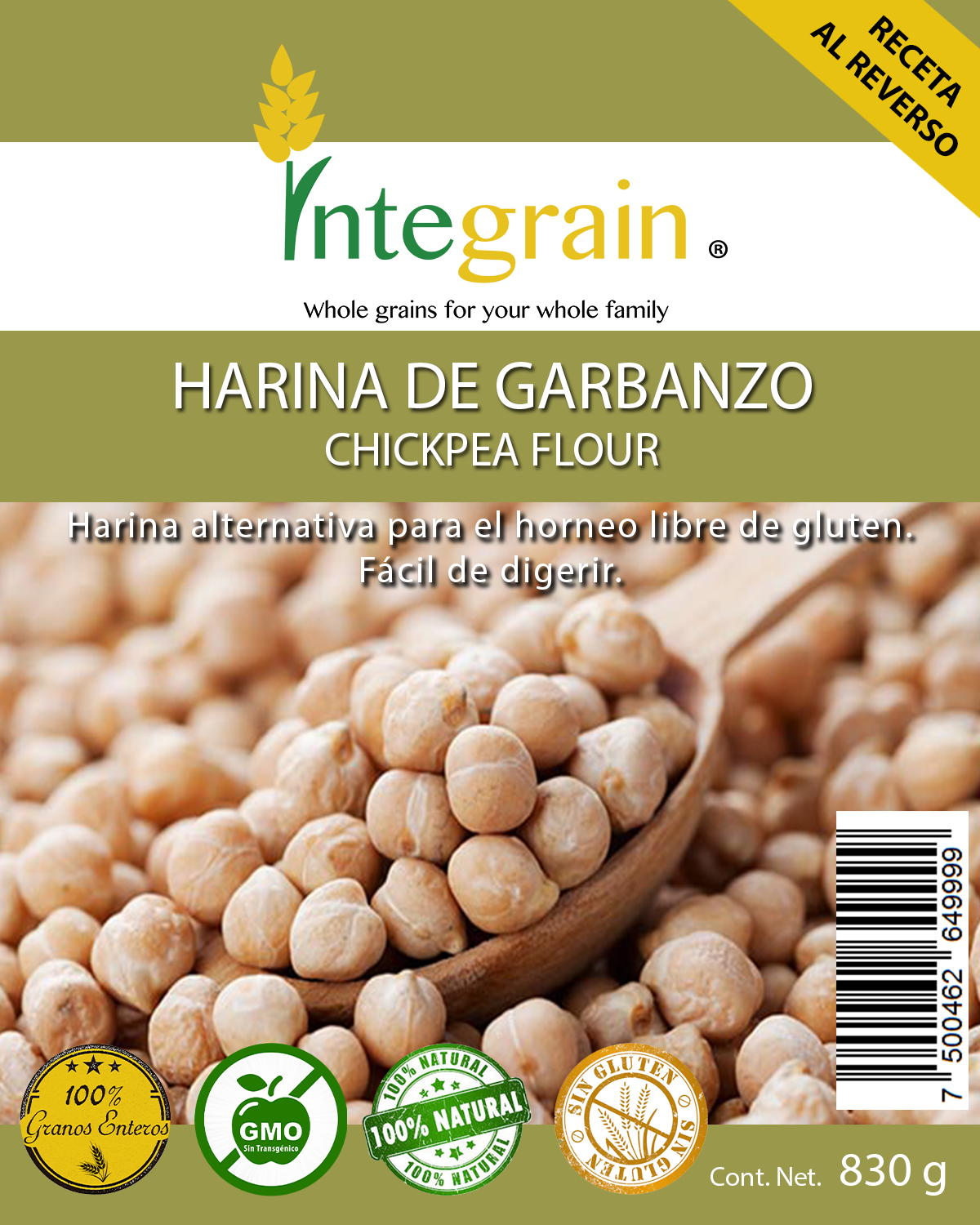Todos nuestros productos son completamente integrales, libres de organismos modificados genéticamente (GMO), conservantes y cualquier tipo de tratamiento. Son productos completamente naturales.